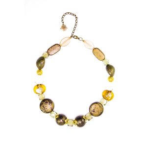 Add to cartRobust charm is captured in this metallic stone, glass and crystal chocker necklace with a 3 inch brass extender to fit any neckline. Complimenting this piece is the personally signed profile card of the artisan who hand-made this piece in her home.