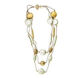 Add to cartA geometric dream of antiqued metallics tied throughout waxy drop rope makes this a necklace that statement you’ve always wanted. Complimenting this piece is the personally signed profile card of the artisan who hand-made this piece in her home.