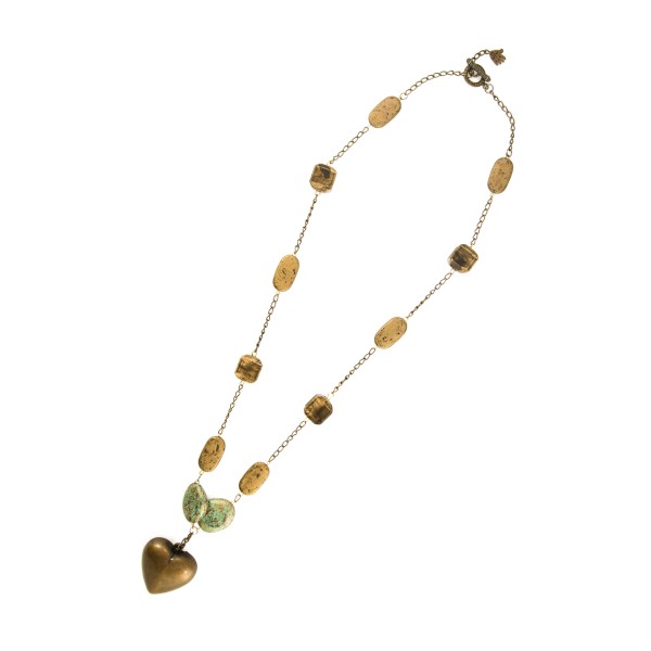 Classic coppers finished with a heart gives this necklace not only meaning but delightful design. Complimenting this piece is the personally signed profile card of the artisan who hand-made this piece in her home. Approx 36 in.