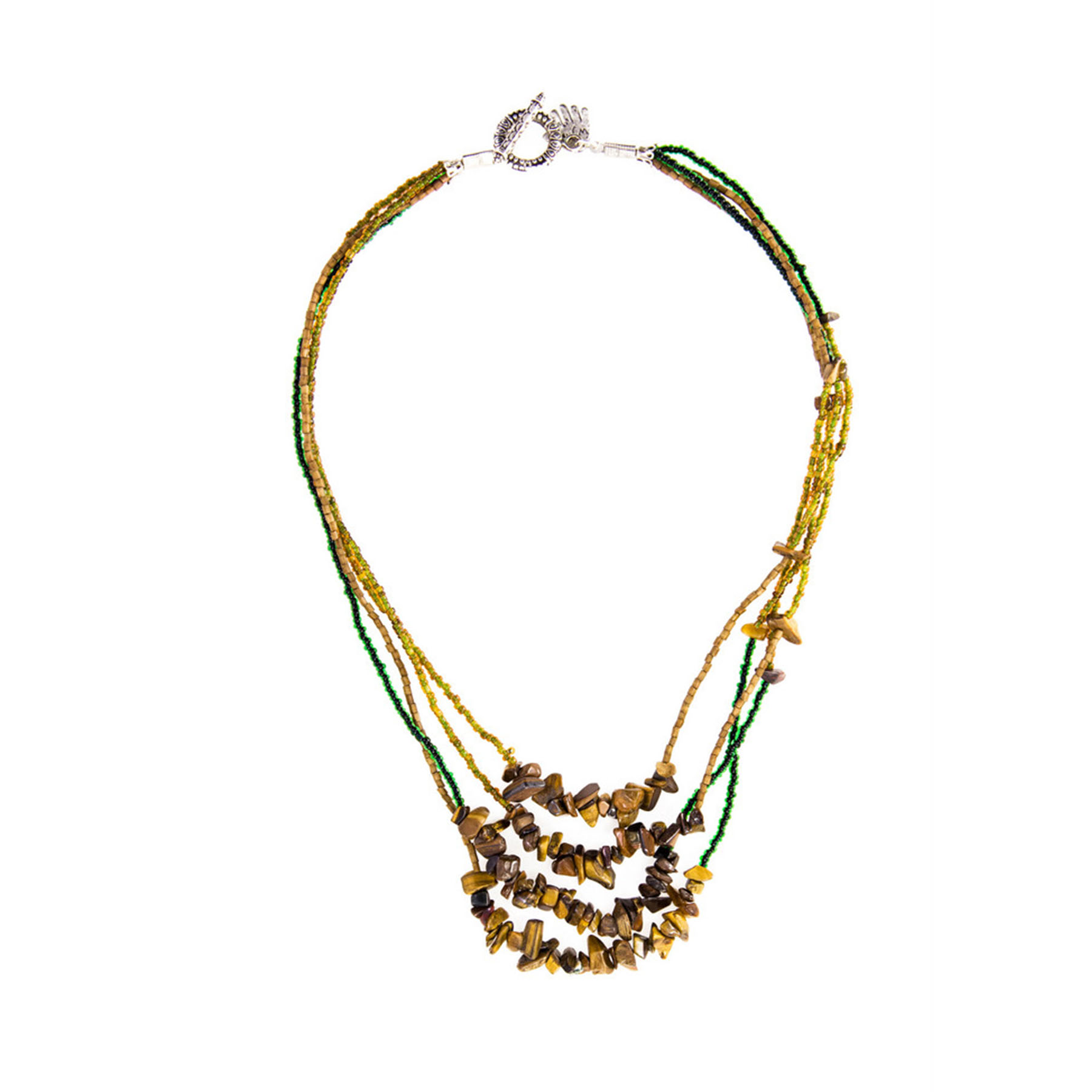 An earthy 4 strand chrysanthemum stone and seed bead design. Complimenting this piece is the personally signed profile card of the artisan who hand-made this piece in her home.