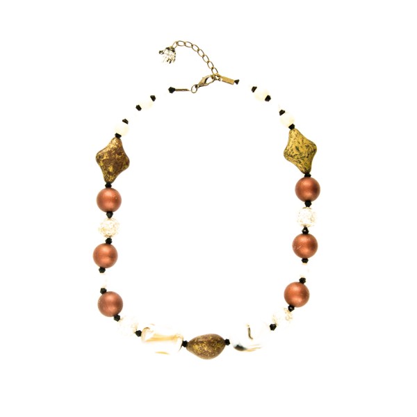 Classic chocker with pearl, wood, silver and camouflage stone with marble perfectly blended. Create an elegant and classy statement with this stunning 3 tier metallic medley accented with pearls. Complimenting this piece is the personally signed profile card of the artisan who hand-made this piece in her home. Approx. 19 in. and a 2 inch extender.